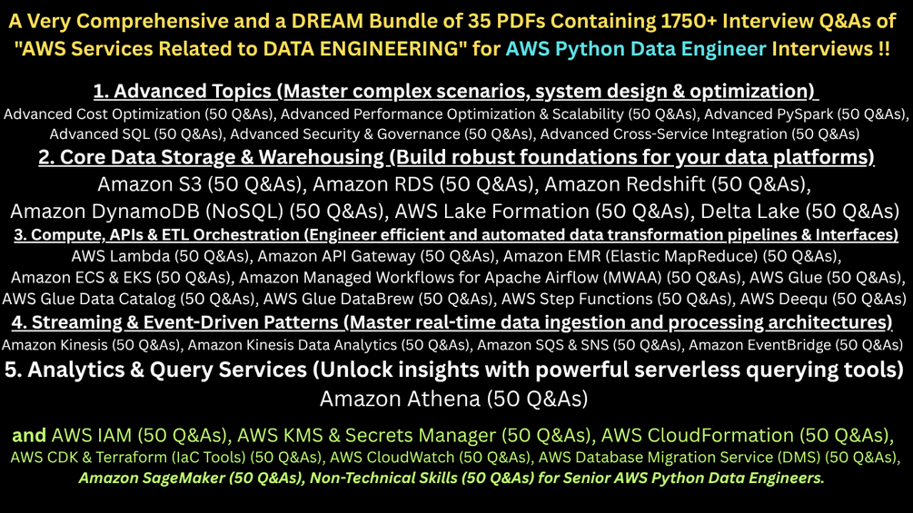 A Very Comprehensive and a DREAM Bundle of 35 PDFs Containing 1750+ Interview Q&As of "AWS Services Related to DATA ENGINEERING" for AWS Python Data Engineer Interviews !!
