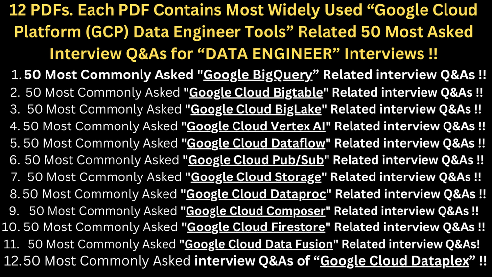 Unlock your pathway to success with the ultimate Most Widely Used Google Cloud Platform (GCP) Data Engineering Tools Interview Q&A Bundle of 12 PDFs. This comprehensive collection features 600 meticulously crafted questions and detailed answers across 12 essential GCP tools, including Google BigQuery interview Q&As, Google Bigtable interview Q&As, Google Cloud Composer interview Q&As, Google BigLake interview Q&As, Google Cloud Storage interview Q&As, Google Cloud Dataflow interview Q&As, Google Cloud Dataproc interview Q&As, Gooogle Cloud Pub/Sub interview Q&As, Google Cloud Dataplex interview Q&As, and more. Designed by experts, these Q&As cover real-world scenarios, advanced problem-solving techniques, and practical knowledge to help you ace your interviews. Whether you're a beginner aiming to break into data engineering or a professional seeking to level up, this bundle equips you with the insights to stand out. Make your dream job a reality—start preparing today with this in-depth, value-packed resource! Below you people can check previews of each PDFs: