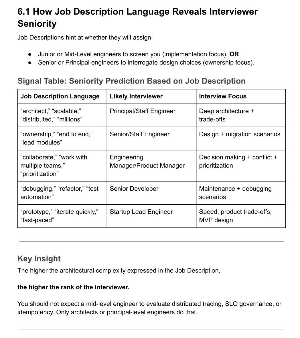 The preview outlines how different interviewer types focus on design depth, operational stability, product reasoning, or cross-functional behavior.