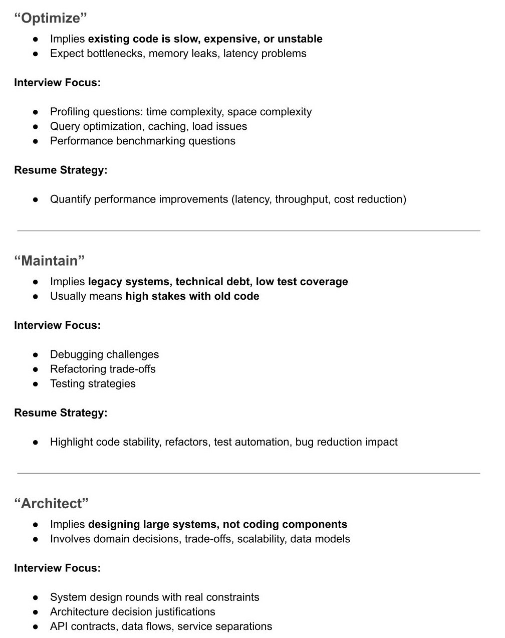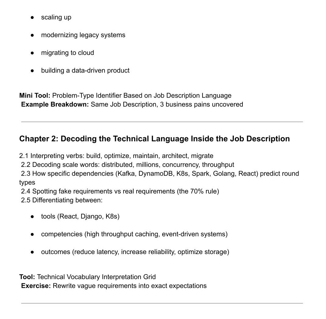 This chapter breaks down the meaning of verbs (“build,” “optimize,” “migrate”), scale indicators (“millions,” “distributed,” “throughput”), and technical dependencies such as Kubernetes, Kafka, Spark, DynamoDB, React, Golang, etc.