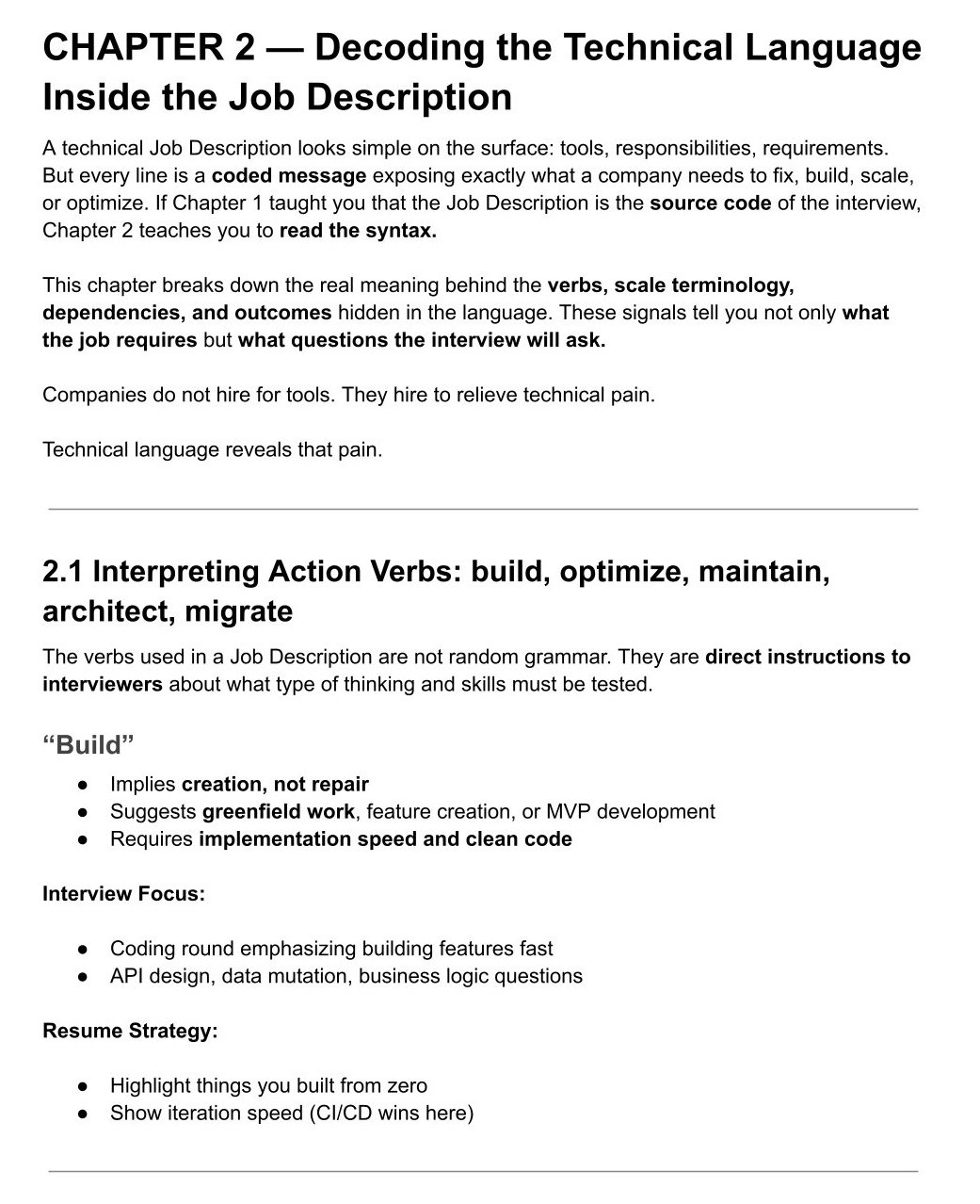This Job Description Decoding Manual is a 300+ page tactical guide that turns the hiring process into a science. This Job Description Decoding Manual is not a standard interview guide. It is an Intelligence System. It teaches you how to treat a Job Description (JD) like source code—decoding the hiring manager's hidden pains, predicting the exact interview rounds, and calculating your salary leverage with mathematical precision.