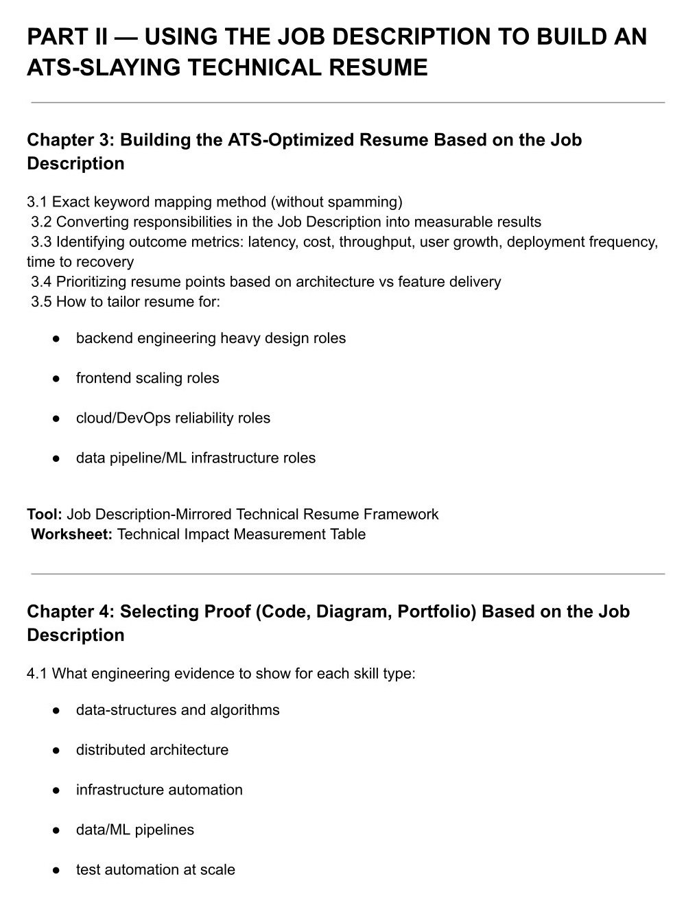 This chapter shows how to transform JD responsibilities into measurable outcome-based bullets for ATS systems.
