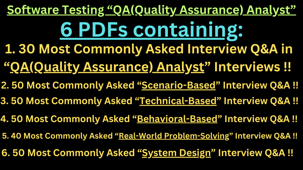 6 PDFs containing ALL Types of Most Asked Interview Q&A (Scenario-Based, Technical-Based, Behavioral-Based, System Design, Real-World Problem-Solving and Generally Most Asked ) required for " Software Testing Quality Assurance (QA) Analyst " Interviews !!