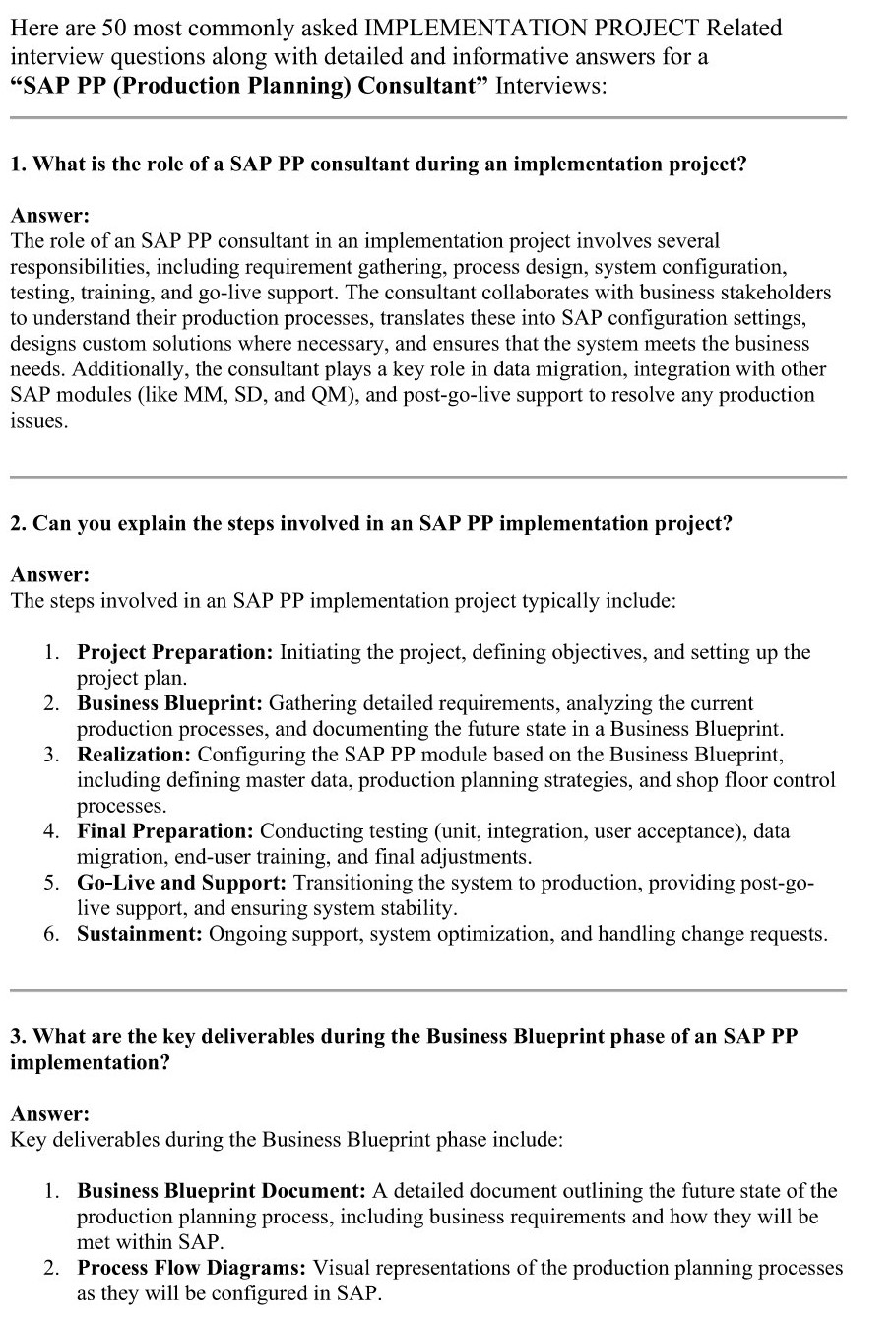 - Here is the preview of First 5 Pages of PDF containing "50 Most Commonly Asked IMLEMENTATION PROJECT Related Interview Q&A" in your SAP PP (Production Planning) Consultant Interviews: