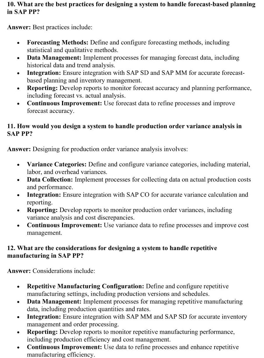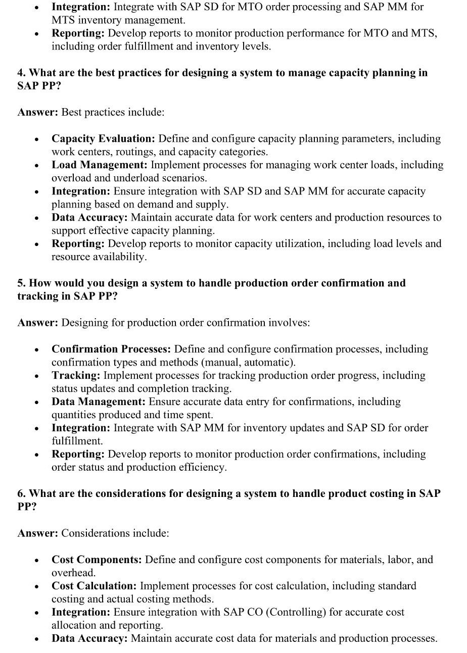 - Focus on SYSTEM DESIGN with questions that explore the creation and optimization of SAP PP solutions. This section helps you understand how to design efficient and scalable production planning systems.