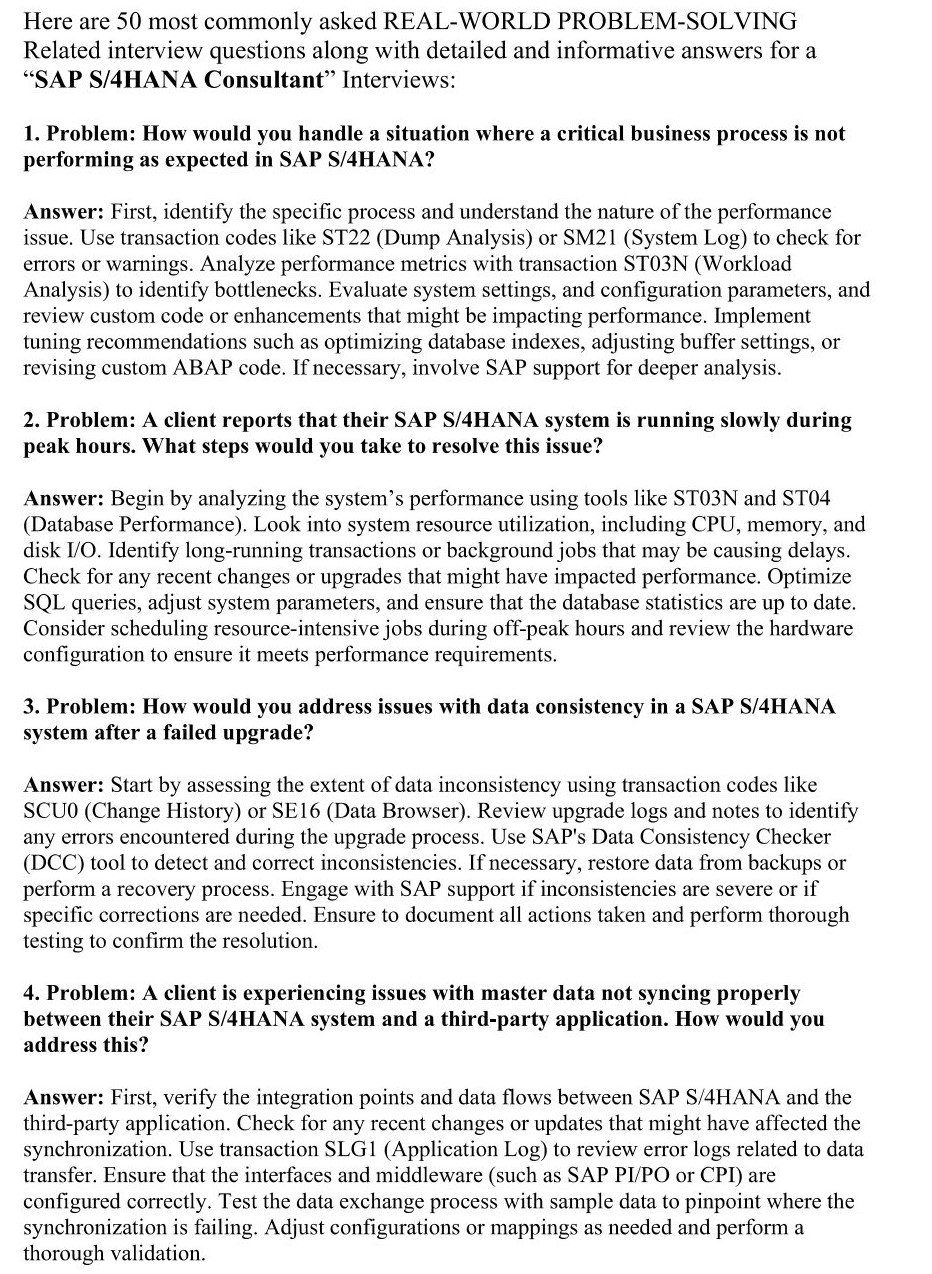 - Here is the preview of first 3 Pages of PDF containing "50 Most Commonly Asked REAL-WORLD PROBLEM-SOLVING Related Interview Q&A" in your SAP S/4HANA Consultant Interviews: