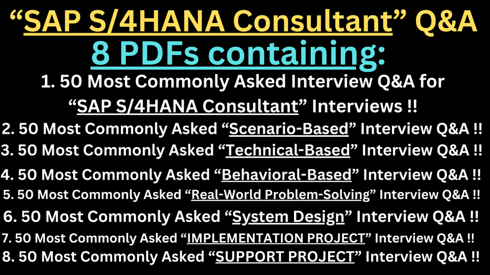 8 PDFs of ALL Types of Most Asked Interview Q&A (Scenario-Based, Technical-Based, Behavioral-Based, System Design, Real-World Problem-Solving, Generally Most Asked, Implementation and Support ) Required for your "SAP S/4HANA Consultant" Interviews !!